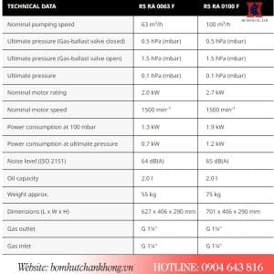 Bảng thông số kỹ thuật bơm hút chân không vòng dầu Busch R5 0100F